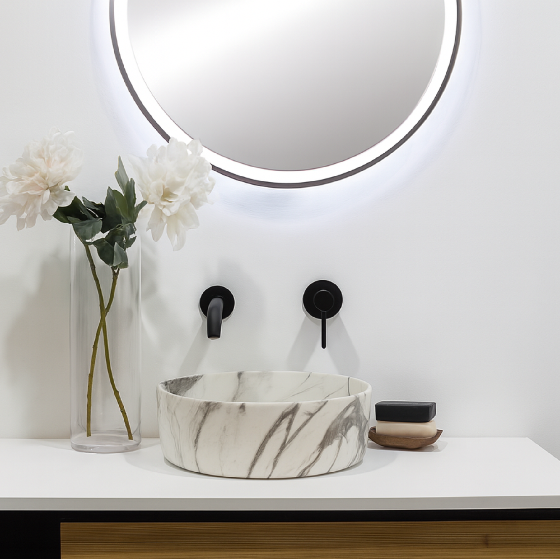 El lavabo sobre encimera Rondo destaca por su elegante diseño redondo con acabado en mármol, perfecto para baños modernos y sofisticados. Su estética única lo convierte en una pieza decorativa que combina estilo y funcionalidad a la perfección.
