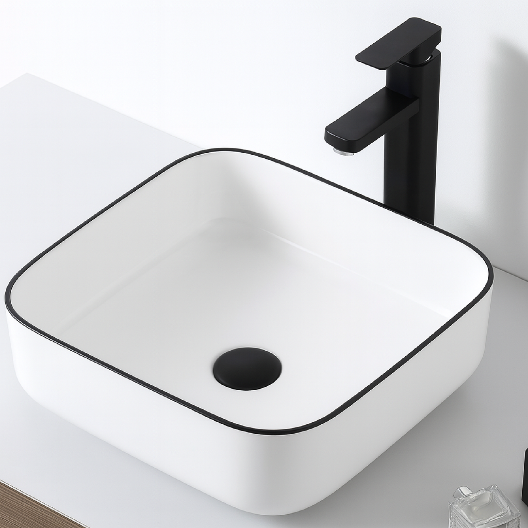 Lavabo sobre encimera cuadrado blanco con borde negro