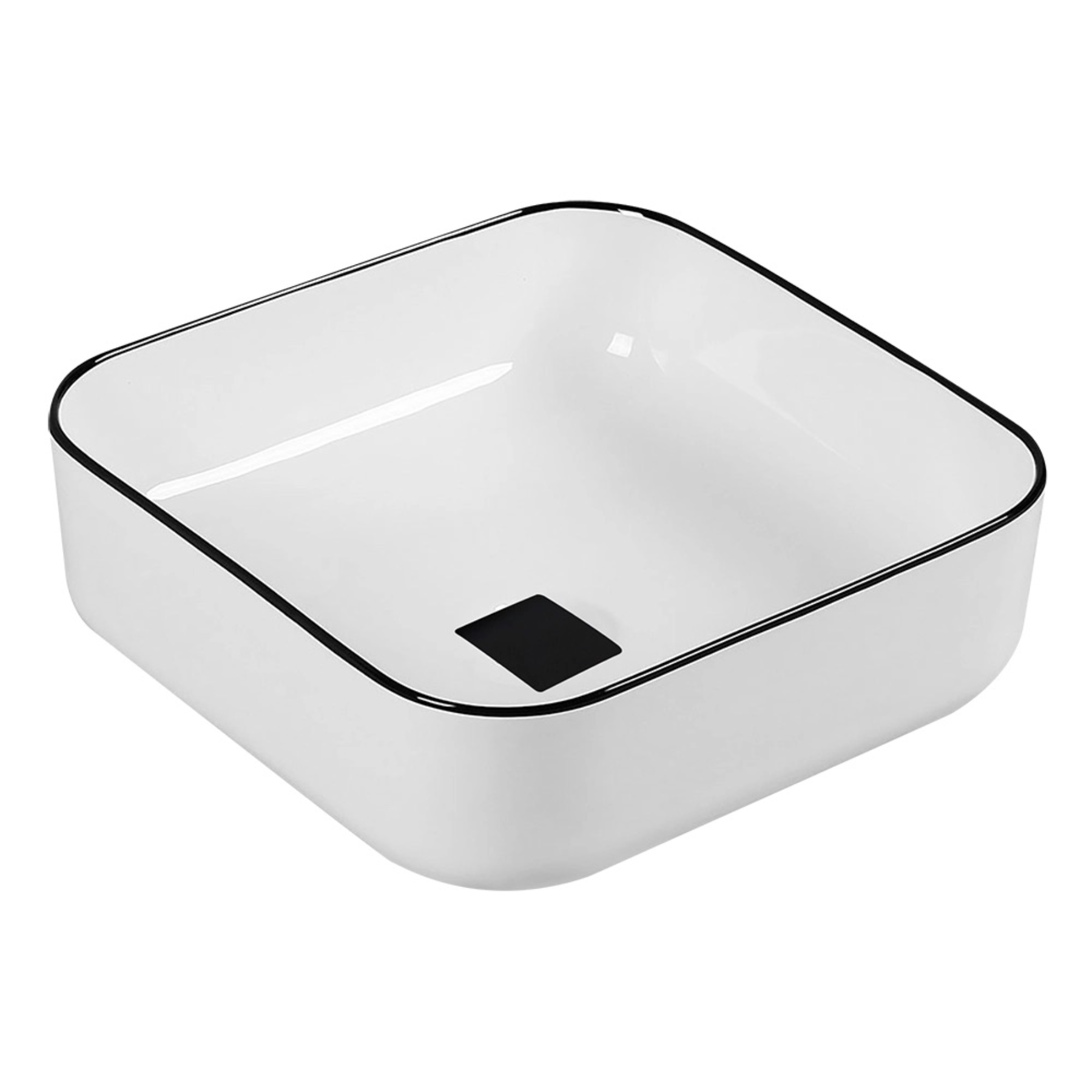 Este lavabo cuadrado con borde negro es perfecto para quienes buscan un baño elegante y actual. Su diseño moderno y la combinación blanco-negro lo convierten en una pieza de alto impacto visual.